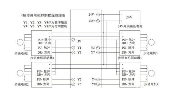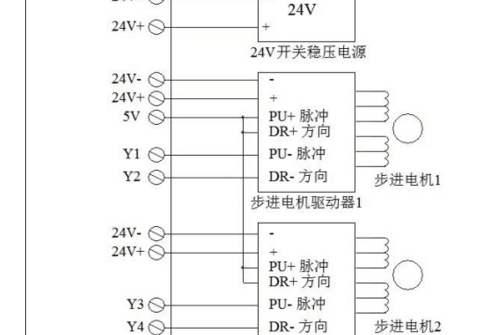 兩軸接線服電機法要注意步進電機驅動器1中pu+脈沖和dr+方向連接是步進電機2中pu+脈沖和dr+方向,其中步進機1中pu+脈沖還連接著5v。