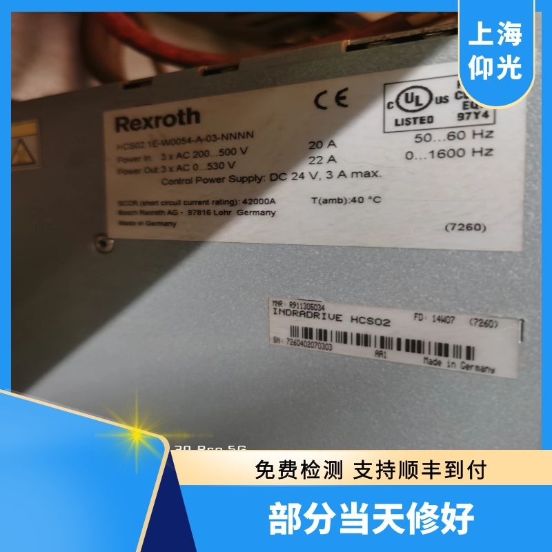 力士樂伺服放大器報警F8069維修案例:2022年4月7號下午13:25左右接到一個浙江寧波客戶電話,有臺力士樂伺服放大器報警F8069需要維修,完整型號:HCS02-1E-W0054-A-03-NNNN,經工程部確認此故障是伺服驅動器內部+-15V直流出錯,內部有+24V轉+-15V電路,它出現故障或內部的集成芯片短路。需要更換HCS或CSB,客戶現場滿足不了伺服放大器修復條件,但是客戶又同型號備件,我司工程師協助客戶更換完好放大器后,設備正常運行,因這段時間上海新冠疫情比較嚴重,維修件不能快遞到上海,和客戶溝通好把損壞的那臺力士樂伺服放大器HCS02-1E-W0054-A-03-NNNN快遞到安徽合肥讓我們駐廠工程師進行維修。